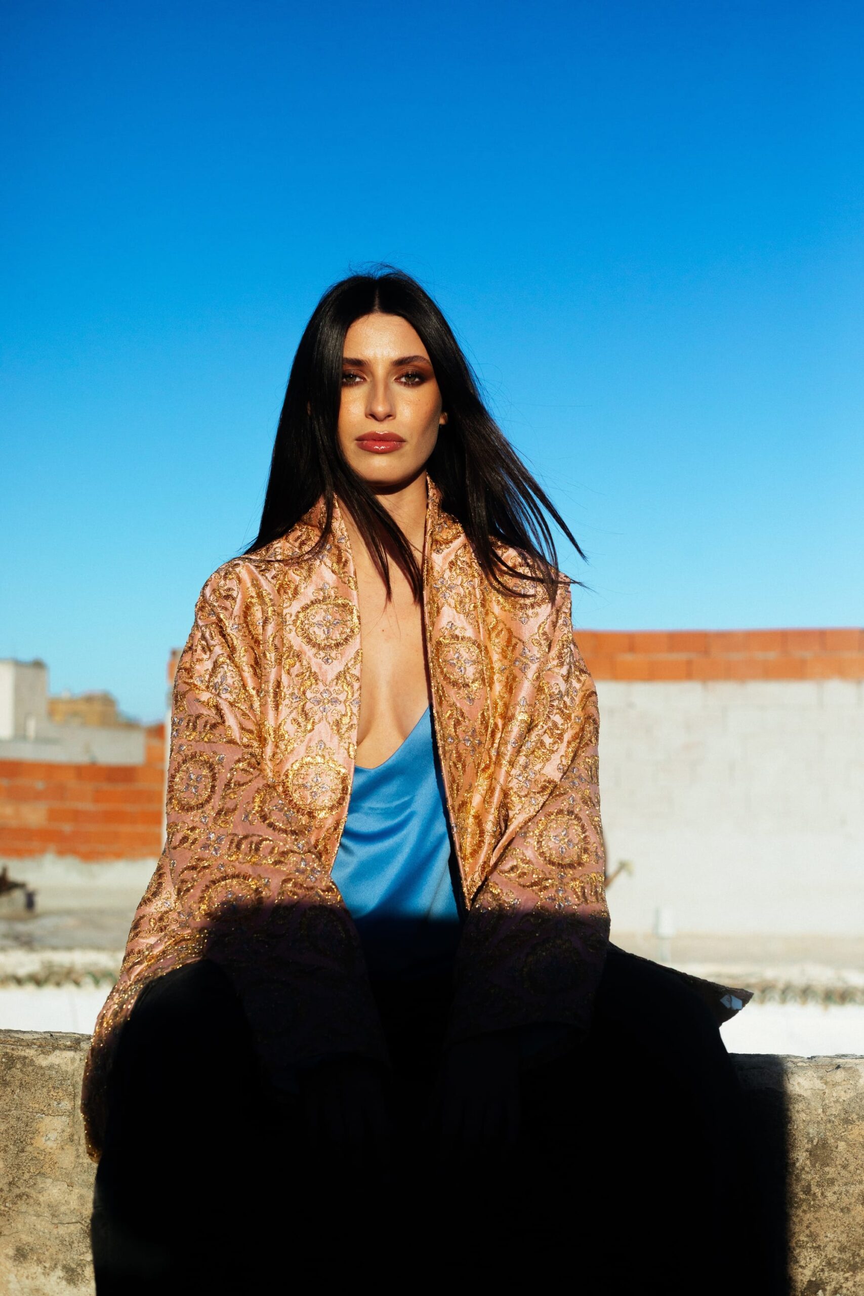 Tissu rose poudré ou pêche, orné de broderies ton sur ton et dorées d’une finesse exquise. Motifs orientaux et floraux en fil d’or, créant une texture riche qui scintille subtilement à la lumière. Coupe ample et ouverte, polyvalente et confortable, alliant décontraction et sophistication. S’associe parfaitement à un top en soie ou satin bleu ciel pour un contraste élégant et moderne.